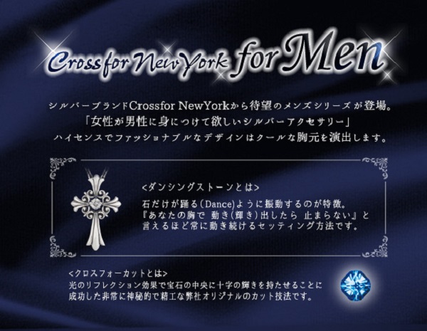クロスフォーニューヨークから、待望のメンズシリーズが登場しました。ダンシングストーン クロスフォーメンズは、女性が男性に身につけてほしいシルバーアクセサリーです。